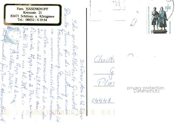 73079366 alte Postkarte Schoenau Koenigssee Pension Familie Hasenknopf postalisch gelaufen Erhaltung siehe scans [KathaD81] KatCode: 11110009172132