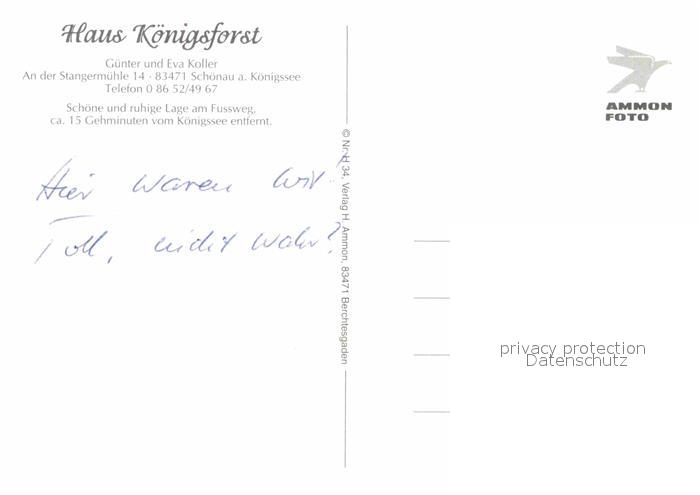 72828281 Schoenau Koenigssee Pension Gaestehaus Haus Koenigsforst Kirche Alpenblick postalisch nicht gelaufen Erhaltung siehe scans [FriedD77] KatCode: 11110009172132
