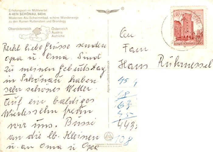 alte Postkarte Schoenau Muehlkreis Oberoesterreich AT Sommerfrische Erholungsort im Muehlviertel postalisch gelaufen Fliegeraufnahme Erhaltung siehe scans [FriedD77]