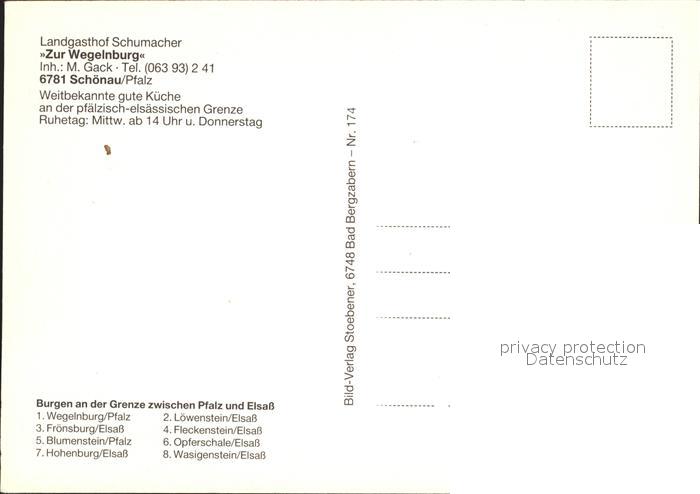 72921494 Schoenau Pfalz Wegelnburg Froensburg Blumenstein Hohenburg Loewenstein Fleckenstein Opferschale Wasigenstein postalisch nicht gelaufen Erhaltung siehe scans [WerneD48] KatCode: 11110007340045
