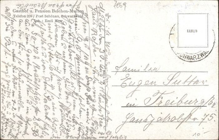 30726113 alte Postkarte Schoenau Schwarzwald asthof Pension Belchen Multen postalisch gelaufen KatCode: 11110008336079