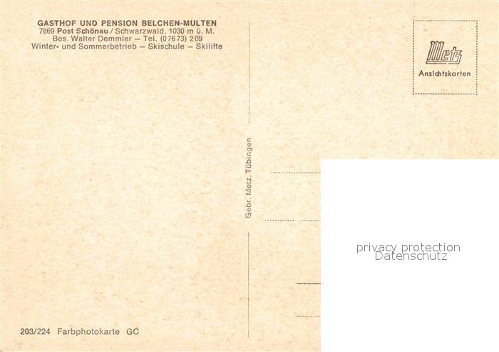 72673018 Schoenau Schwarzwald Gasthaus Pension Belchen Multen postalisch nicht gelaufen Erhaltung siehe scans [AndreD76] KatCode: 11110008336079