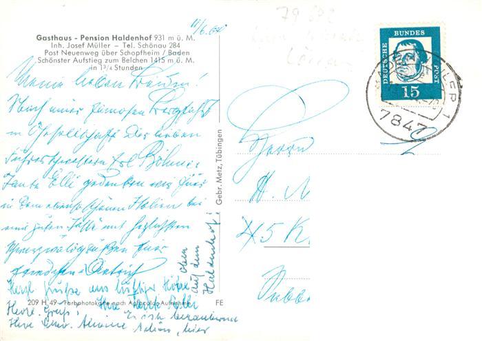 73894848 alte Postkarte Schoenau Schwarzwald Gasthaus Pension Haldenhof postalisch gelaufen Erhaltung siehe scans [FriedD77] KatCode: 11110008336079