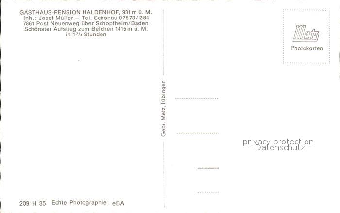 71940971 Schoenau Schwarzwald Gasthaus Pension Haldenhof postalisch nicht gelaufen Erhaltung siehe scans KatCode: 11110008336079