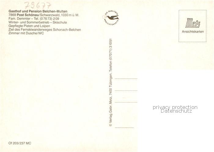 73836232 Schoenau Schwarzwald Gasthof Pension Belchen Multen postalisch nicht gelaufen Erhaltung siehe scans [WerneD78] KatCode: 11110008336079