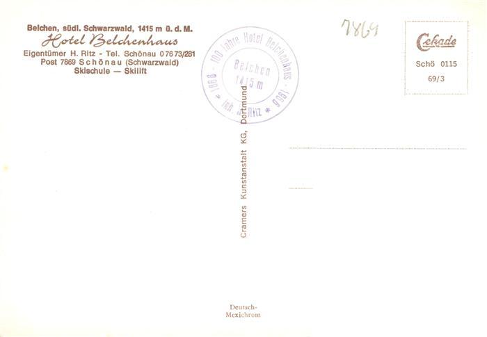 73928307 Schoenau Schwarzwald Hotel Belchenhaus postalisch nicht gelaufen Erhaltung siehe scans [WerneD78] KatCode: 11110008336079