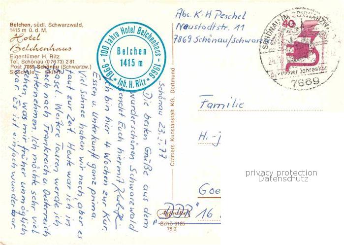 72918045 alte Postkarte Schoenau Schwarzwald Hotel Belchenhaus postalisch gelaufen Erhaltung siehe scans [KathaD81] KatCode: 11110008336079