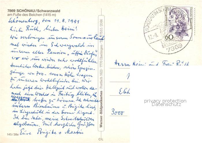 73597257 alte Postkarte Schoenau Schwarzwald Panorama postalisch gelaufen Erhaltung siehe scans [WerneD78] KatCode: 11110008336079