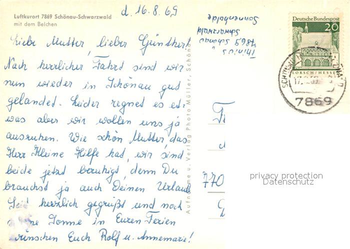 73265865 alte Postkarte Schoenau Schwarzwald Panorama Luftkurort mit Belchen postalisch gelaufen Erhaltung siehe scans [FriedD77] KatCode: 11110008336079