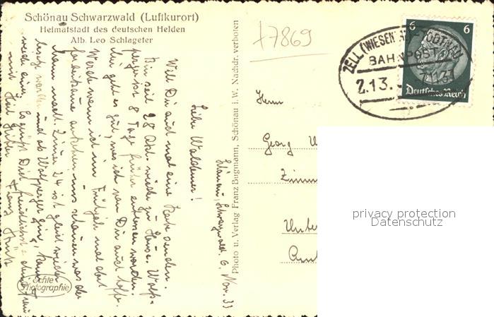 41545772 Schoenau Schwarzwald Panorama Porträt Alb. Leo Schlageter KatCode 11110008336079