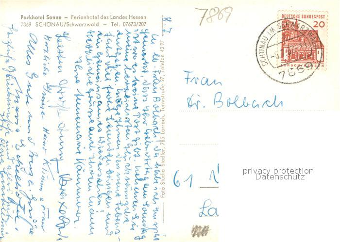 73751944 alte Postkarte Schoenau Schwarzwald Parkhotel Sonne postalisch gelaufen Erhaltung siehe scans [WerneD78] KatCode: 11110008336079