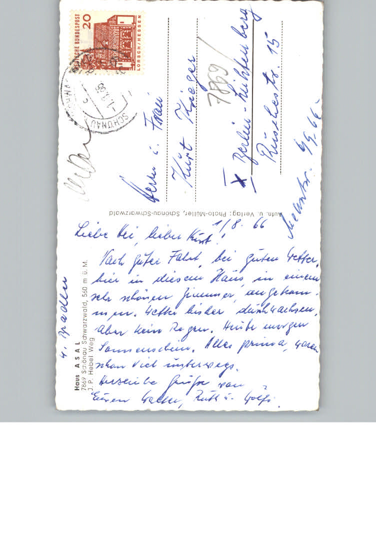 31153464 Schoenau Schwarzwald Pension Haus Asal postalisch nicht gelaufen KatCode: 11110008336079
