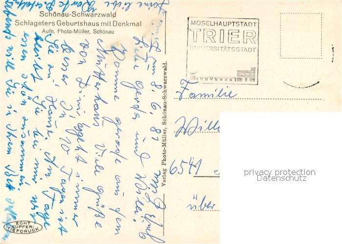 73739414 alte Postkarte Schoenau Schwarzwald Schlageters Geburtshaus mit Denkmal postalisch gelaufen Erhaltung siehe scans [FriedD77] KatCode: 11110008336079
