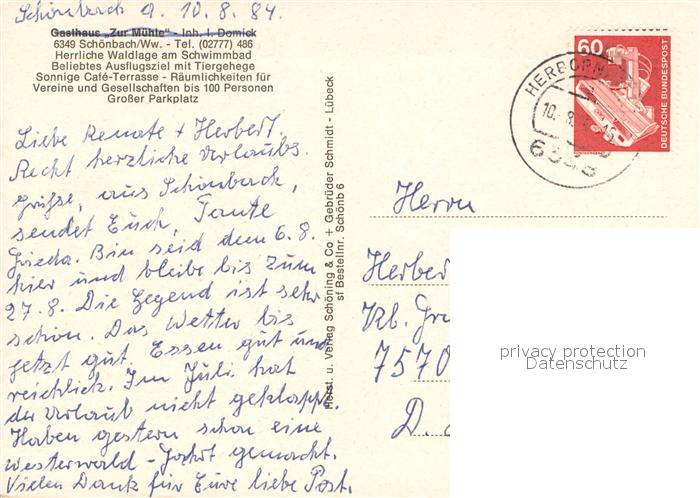 73646013 alte Postkarte Schoenbach Dillkreis Gasthaus Zur Muehle im Westerwald Restaurant Terrasse Freibad Hirsch postalisch gelaufen Erhaltung siehe scans [FriedD77] KatCode: 11110006532012