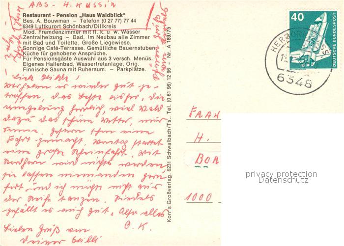 73646017 alte Postkarte Schoenbach Dillkreis Restaurant Pension Haus Waldblick postalisch gelaufen Erhaltung siehe scans [FriedD77] KatCode: 11110006532012
