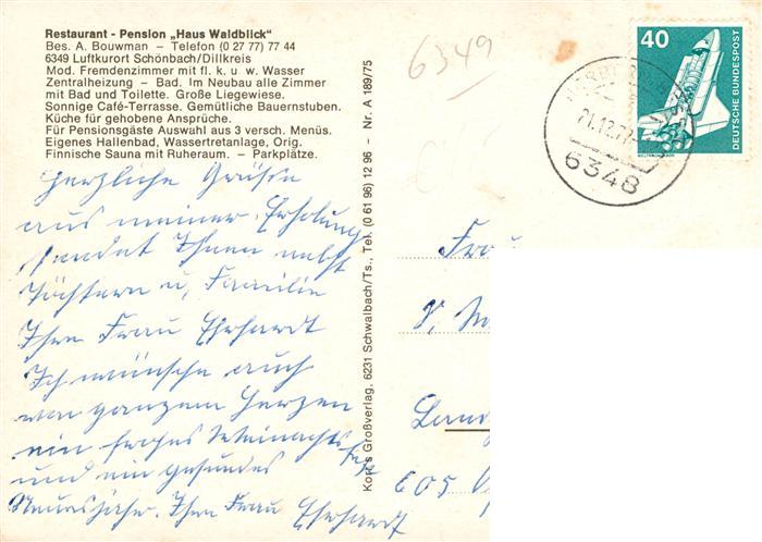 73911567 alte Postkarte Schoenbach Dillkreis Restaurant Pension Haus Waldblick postalisch gelaufen Erhaltung siehe scans [WerneD78] KatCode: 11110006532012