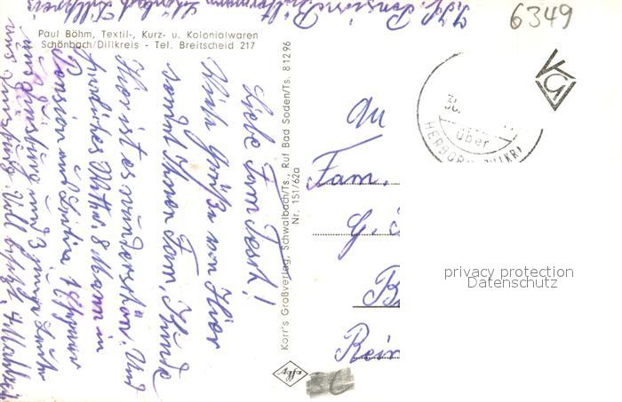 73706168 alte Postkarte Schoenbach Dillkreis Teilansicht postalisch gelaufen Erhaltung siehe scans [LiesaD40] KatCode: 11110006532012