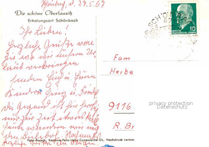 72704132 alte Postkarte Schoenbach Sachsen Kirche Weiher Panorama postalisch gelaufen Erhaltung siehe scans [AndreD76] KatCode: 11110014286400