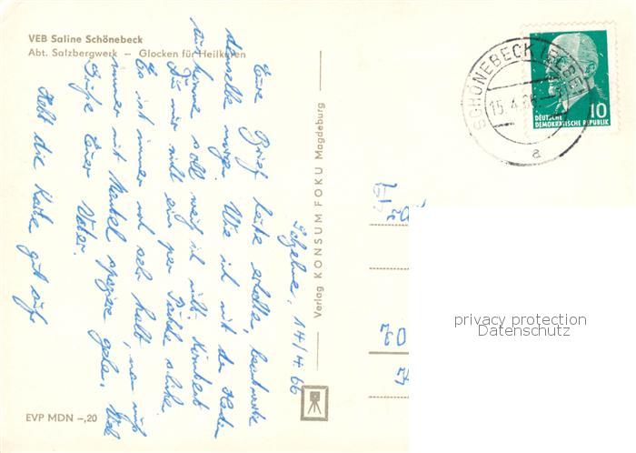 73869199 alte Postkarte Schoenbeck Mecklenburg VEB Saline Schoenbeck Salzbergwerk Glocken fuer Heilkuren postalisch gelaufen Erhaltung siehe scans [WerneD78] KatCode: 11110013055061