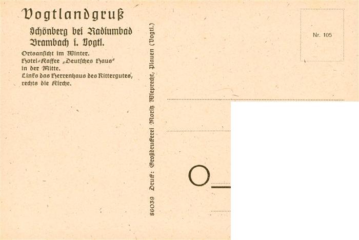 73872505 Schoenberg Bad Brambach Ortsansicht mit Kirche im Winter Hotel Deutsches Haus Herrenhaus des Rittergutes postalisch nicht gelaufen Erhaltung siehe scans [FriedD77] KatCode: 11110014178040