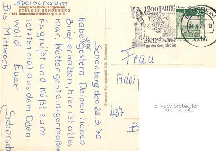 72927920 alte Postkarte Schoenberg Bensheim Knappschaftsvorsorgeheim Schloss Schoenberg Restaurant postalisch gelaufen Erhaltung siehe scans [FriedD77] KatCode: 11110006431002