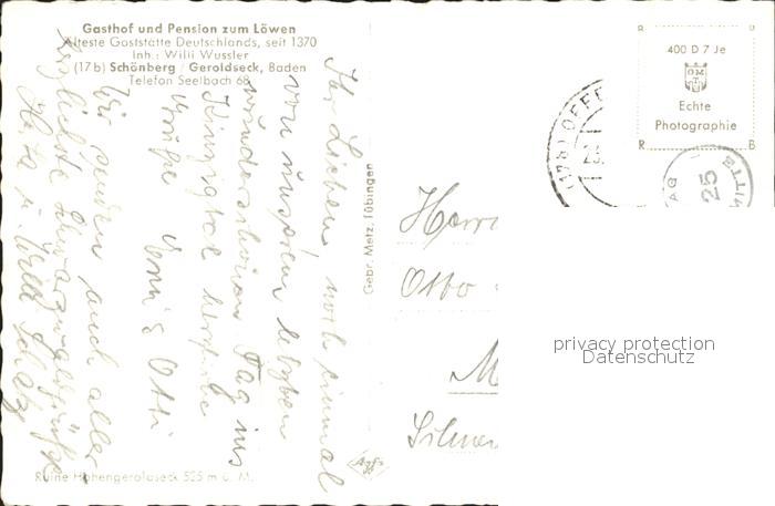 72062241 alte Postkarte Schoenberg Seelbach Gasthof Pension Loewen Geroldseck postalisch gelaufen Erhaltung siehe scans KatCode: 11110008317127