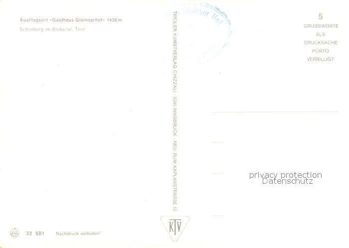 73159801 Schoenberg Stubaital Ausflugsort Gasthaus Gleinserhof Stubaier Alpen postalisch nicht gelaufen Erhaltung siehe scans [FriedD77] KatCode: 11390332070350