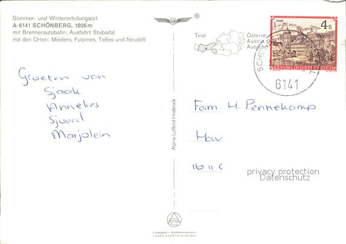 72444221 alte Postkarte Schoenberg Stubaital Fliegeraufnahme postalisch gelaufen Erhaltung siehe scans KatCode: 11390332070350