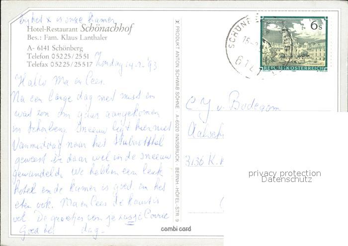 72479810 alte Postkarte Schoenberg Stubaital Hotel Restaurant Schoenacher Hof postalisch gelaufen Erhaltung siehe scans KatCode: 11390332070350