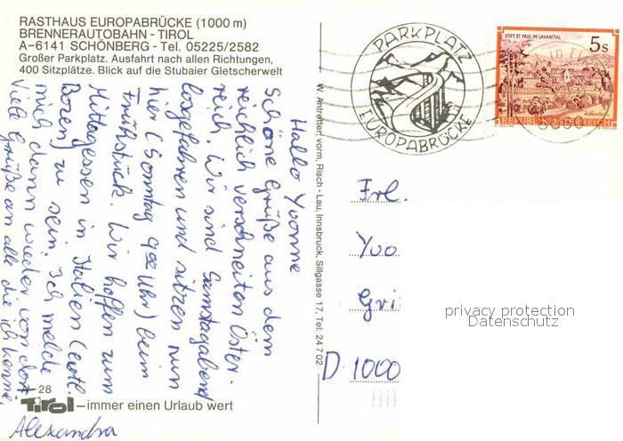 72716947 alte Postkarte Schoenberg Stubaital Rasthaus Europabruecke Brennerautobahn Stubaier Alpen postalisch gelaufen Erhaltung siehe scans [FriedD77] KatCode: 11390332070350