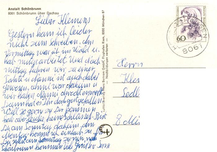73897700 alte Postkarte Schoenbrunn Dachau Anstalt Schoenbrunn Fliegeraufnahme postalisch gelaufen Erhaltung siehe scans [FriedD77] KatCode: 11110009174141