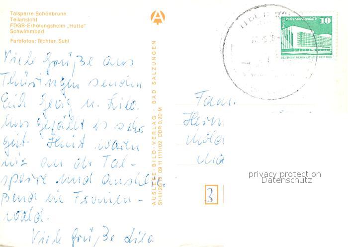 72953545 alte Postkarte Schoenbrunn Greiz Talsperre Teilansicht FDGB Erholungsheim Huette Schwimmbad postalisch gelaufen Erhaltung siehe scans [WerneD78] KatCode: 11110016076091