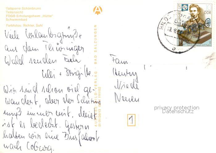 73061744 alte Postkarte Schoenbrunn Schleusegrund Talsperre FDGB Erholungsheim Huette Schwimmbad postalisch gelaufen Erhaltung siehe scans [FriedD77] KatCode: 11110016069042