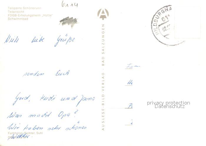72941764 alte Postkarte Schoenbrunn Schleusegrund Talsperre Schoenbrunn Panorama FDGB Erholungsheim Huette Schwimmbad postalisch gelaufen Erhaltung siehe scans [WerneD78] KatCode: 11110016069042