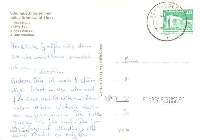 73099944 alte Postkarte Schoenebeck Salzelmen Haupthaus Loehe Saal Andachtssaal Gartenanlage postalisch gelaufen Erhaltung siehe scans [KathaD81] KatCode: 11110015089305