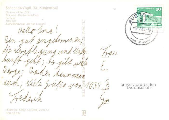 73606903 alte Postkarte Schoeneck Vogtland Blick vom Alten Soell Thaelmann Breitscheid Platz Rathaus Alter Soell Jugendherberge Hertha Lindner postalisch gelaufen Erhaltung siehe scans [WerneD78] KatCode: 11110014178610