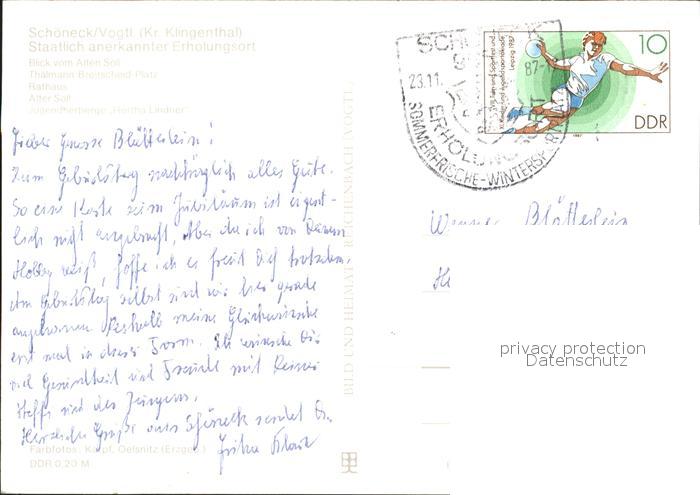 72368145 alte Postkarte Schoeneck Vogtland Blick vom Alten Soll Thaelmann Breitscheid Platz Rathaus Jugendherberge Hertha Lindner postalisch gelaufen Erhaltung siehe scans KatCode: 11110014178610