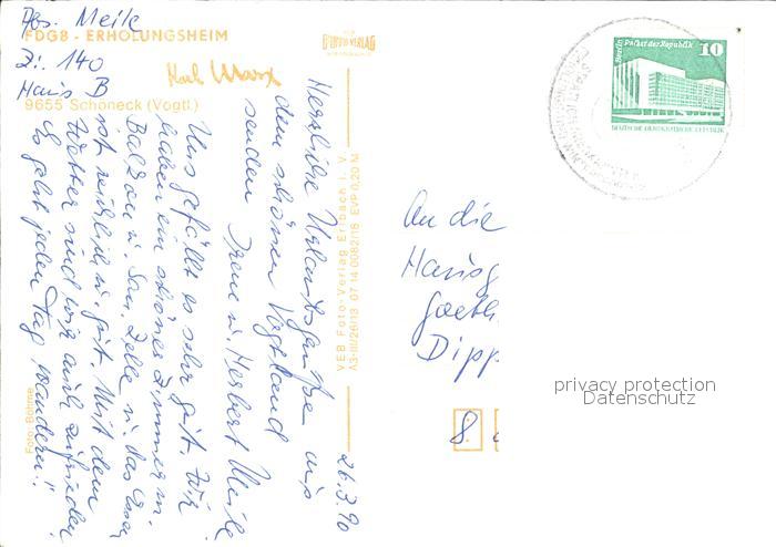 72409637 alte Postkarte Schoeneck Vogtland Erholungsheim Karl Marx postalisch gelaufen Erhaltung siehe scans KatCode: 11110014178610
