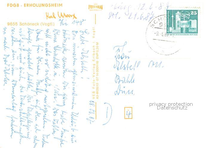 73013556 alte Postkarte Schoeneck Vogtland FDGB-Erholungsheim postalisch gelaufen Erhaltung siehe scans [NatalD47] KatCode: 11110014178610