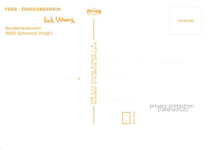 73063156 Schoeneck Vogtland FDGB Erholungsheim Baudenrestaurant postalisch nicht gelaufen Erhaltung siehe scans [FriedD77] KatCode: 11110014178610
