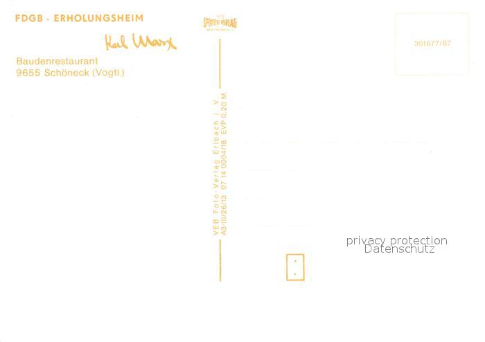 73157094 Schoeneck Vogtland FDGB Erholungsheim Baudenrestaurant postalisch nicht gelaufen Erhaltung siehe scans [FriedD77] KatCode: 11110014178610