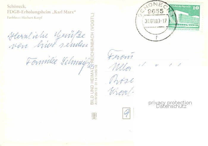 72849693 alte Postkarte Schoeneck Vogtland FDGB Erholungsheim Karl Marx postalisch gelaufen Erhaltung siehe scans [KathaD81] KatCode: 11110014178610