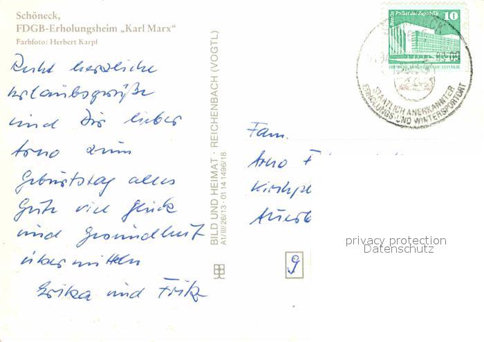 72650915 alte Postkarte Schoeneck Vogtland FDGB Erholungsheim Karl Marx postalisch gelaufen Erhaltung siehe scans [FriedD77] KatCode: 11110014178610