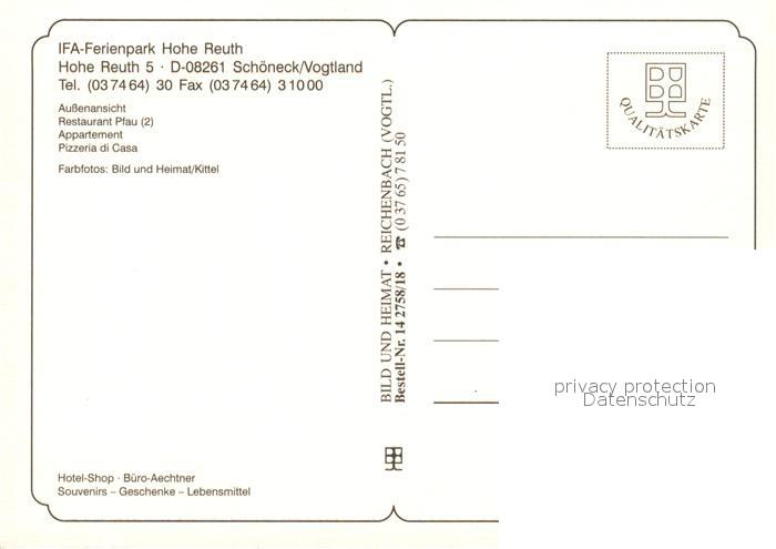 73210284 Schoeneck Vogtland Ferienpark Hohe Reuth Restaurant Appartement Pizzeria postalisch nicht gelaufen Erhaltung siehe scans [FriedD77] KatCode: 11110014178610