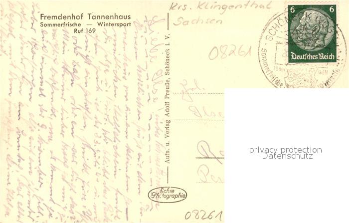 43057826 alte Postkarte Schoeneck Vogtland Fremdenhof Tannenhaus postalisch gelaufen Erhaltung siehe scans [KathaD81] KatCode: 11110014178610