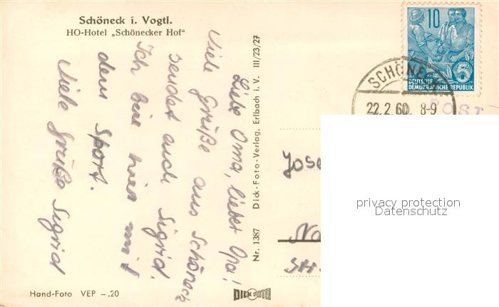 73721821 alte Postkarte Schoeneck Vogtland HO-Hotel Schoenecker-Hof Winter postalisch gelaufen Erhaltung siehe scans [LiesaD40] KatCode: 11110014178610