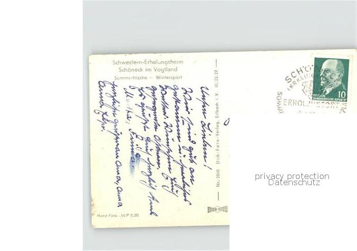 71963413 alte Postkarte Schoeneck Vogtland Schwstern Erholungsheim postalisch gelaufen Erhaltung siehe scans KatCode: 11110014178610