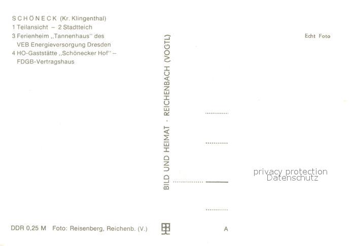 73668949 Schoeneck Vogtland Teilansicht Stadtteich Ferienheim Tannenhaus HO Gaststaette Schoenecker Hof FDGB-Vertragshaus postalisch nicht gelaufen Erhaltung siehe scans [FriedD77] KatCode: 11110014178610