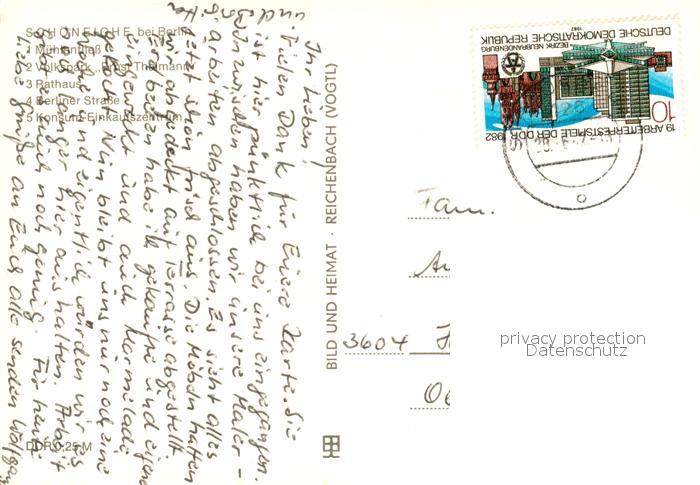 73044954 alte Postkarte Schoeneiche Berlin Muehlenfliess Volkspark Thaelmann Rathaus Berliner Str Konsum Einkaufszentrum postalisch gelaufen Erhaltung siehe scans [WerneD78] KatCode: 11110012067440