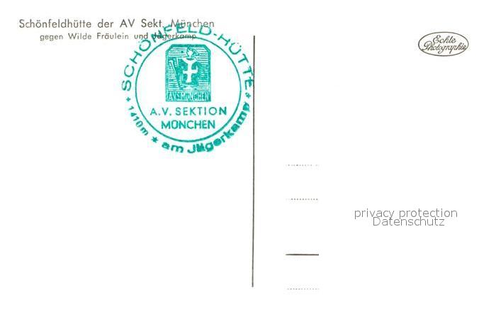 72982588 Schoenfeld Huette Berghaus am Jaegerkamm gegen Wilde Fraeulein Mangfallgebirge postalisch nicht gelaufen Erhaltung siehe scans [FriedD77] KatCode: 11110009182131